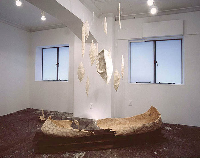 破舟は、現在の地球をも巻き込んだ人間社会を表した隠喩の方舟です。舟の内側には、人間が過去に惹き起した悲しい戦争などの出来事に関係する新聞記事を切り抜き意図を持ってコラージュしています。天井から吊るした物体はこれから方舟に乗ろうとする種や、命のエッセンスを表しています。様々な考え方があると思いますが、私は人類を悲観的には思っておらず、愛すべき、愛しいものと考える立場から希望を覗かせる作品にしたいと思い、タイトルはここから付けました。6~7年前から新聞記事を作品の中にコラージュする方法を採っております。人は悲喜こもごもの様々なものを背負いながら生きているものですが、過去に起こってしまった人間の人間によるつらく悲しい出来事はいまだに尾をひいて現在に至っています。