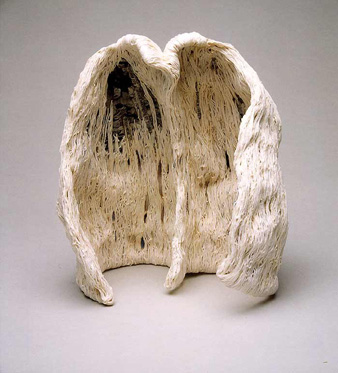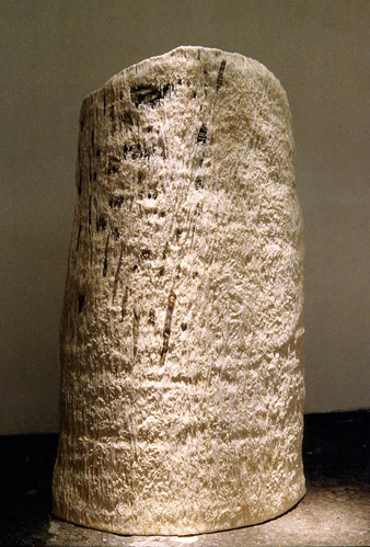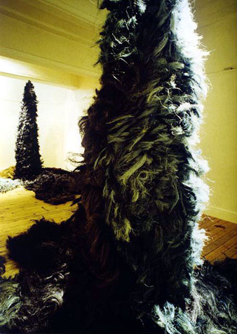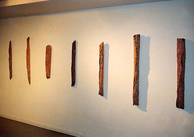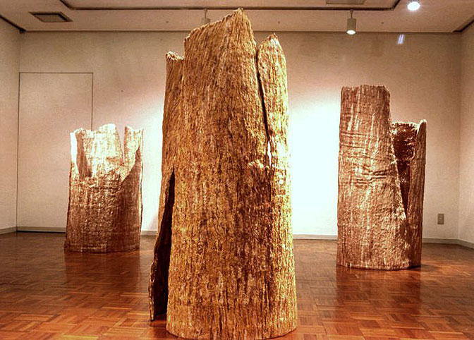 そして更に1999年、千疋屋ギャラリーの個展で、二つのものがお互いに支え合うことによって自立している作品を発表しました。1995年の<時の継続>と同じテーマで“再生”をより強く意識した作品にしたいと考え、<蘇生>と題しました。樹木の肌そのものを繊維で表し、糸は植物染料で染めました。(写真6)