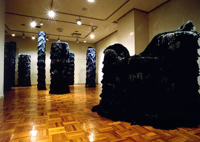 初めての個展、1987年のギャラリー・マロニエでは、<素材へのメッセージ>と題して原毛をフェルティングの技法による、厚く或いは透き通るくらい薄く、又他の素材と組み合わせた作品などで構成しました。1990年、ギャラリーギャラリーではサイザル麻と2重織りの展開技法により素材の持つ力を引き出すべく<生命>と題しました。(写真2)